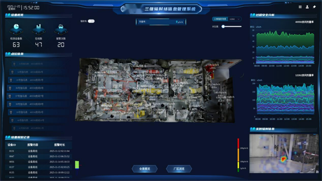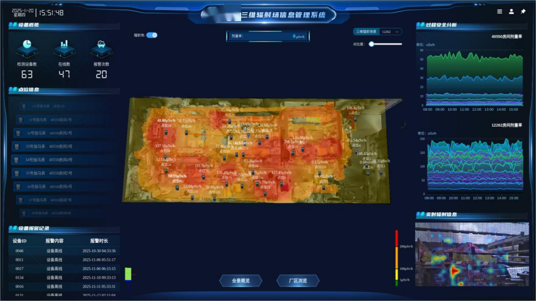 山东核电三维辐射场监测系统首次在1号机组多个重点辐射控制区得到了系统性验证。长期运行显示系统计算值与实测值平均误差优于设计标准,核心算法在复杂工业环境中展现出高度可靠性与适应性,快速、准确、全面地实现厂房内人、事、物的辐射剂量水平的实时监测,完成区域内辐射场态势感知和自主可视化测量与评价。