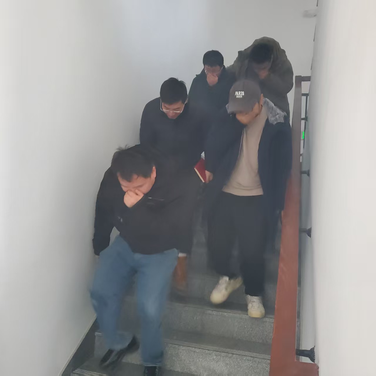 理论培训结束后,研究院随即组织了模拟火灾疏散逃生演练。随着警报声响起,参训人员在疏散引导员的指挥下,严格按照“掩住口鼻、弯腰低姿、有序撤离”的要求,快速、有序地从各楼层疏散至指定安全区域。整个过程组织严密、行动迅速,达到了预期效果。